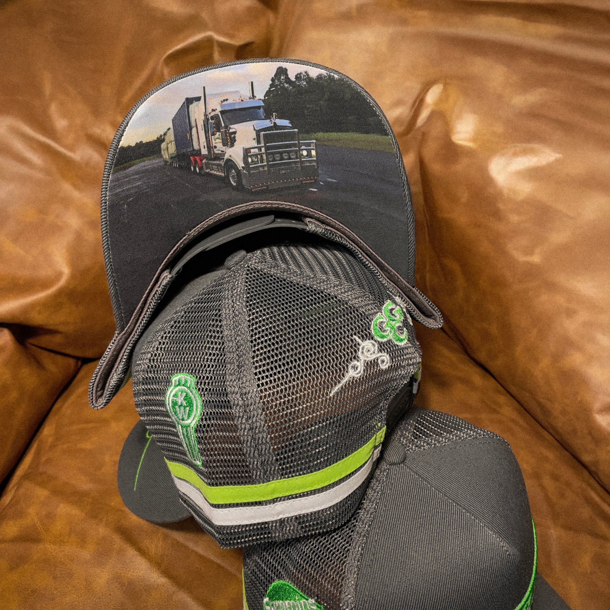 Designed for the Greenlands Garden Centre Moruya, this cap blends deep Grey tones with fleet green, a colourway instantly recognised in transport yards and highway rest stops across the south coast, new south wales. The side embroidery features the Kenworth and Cummins.