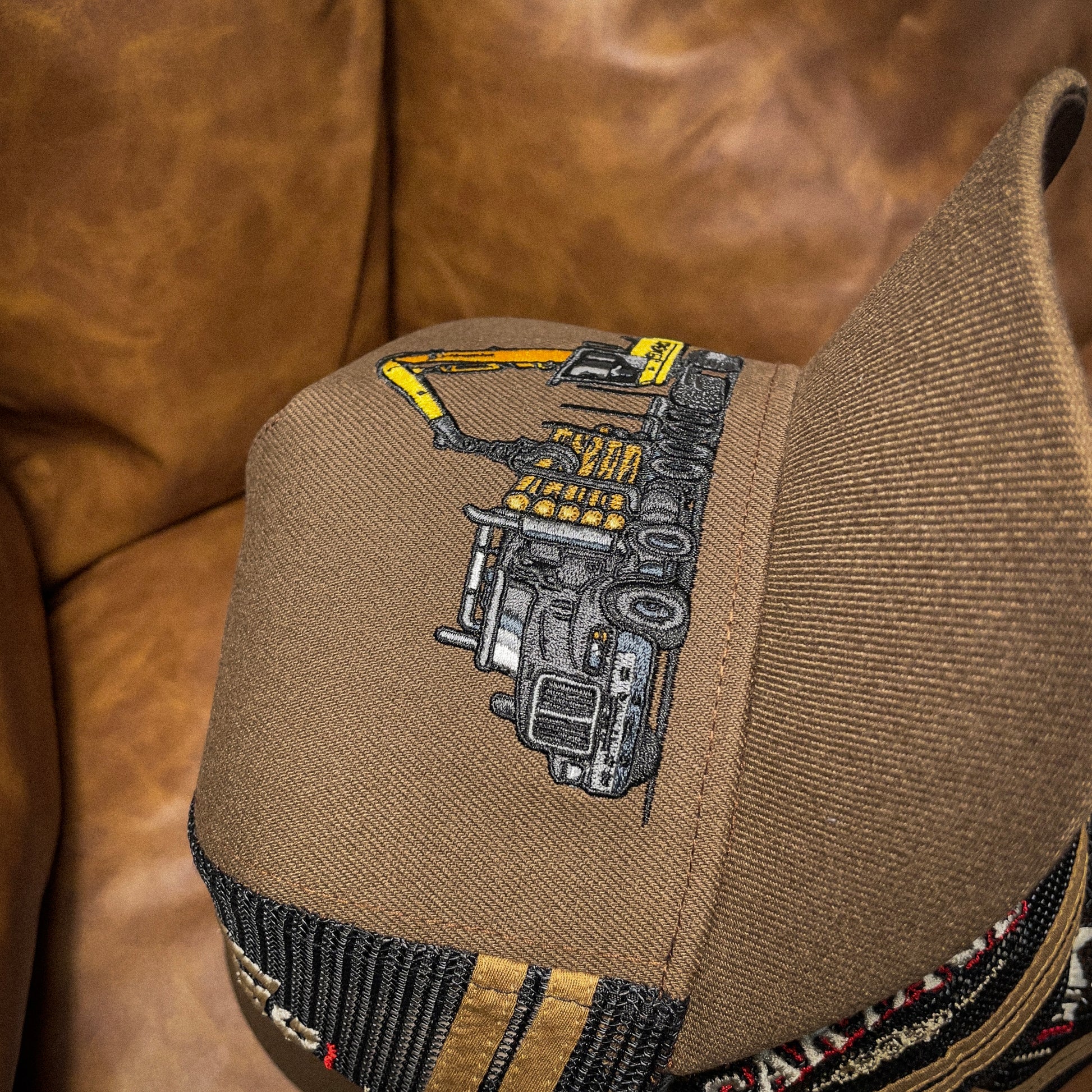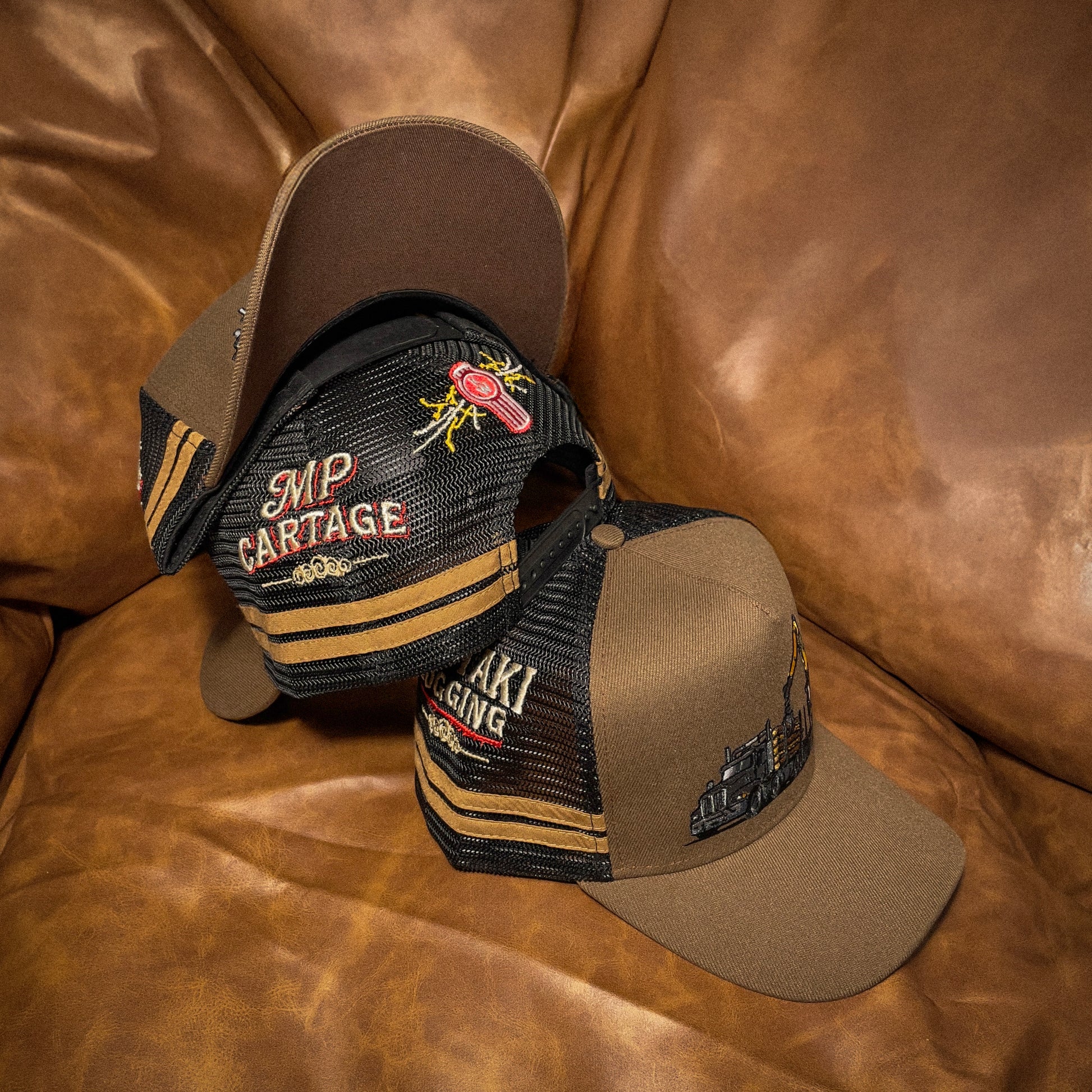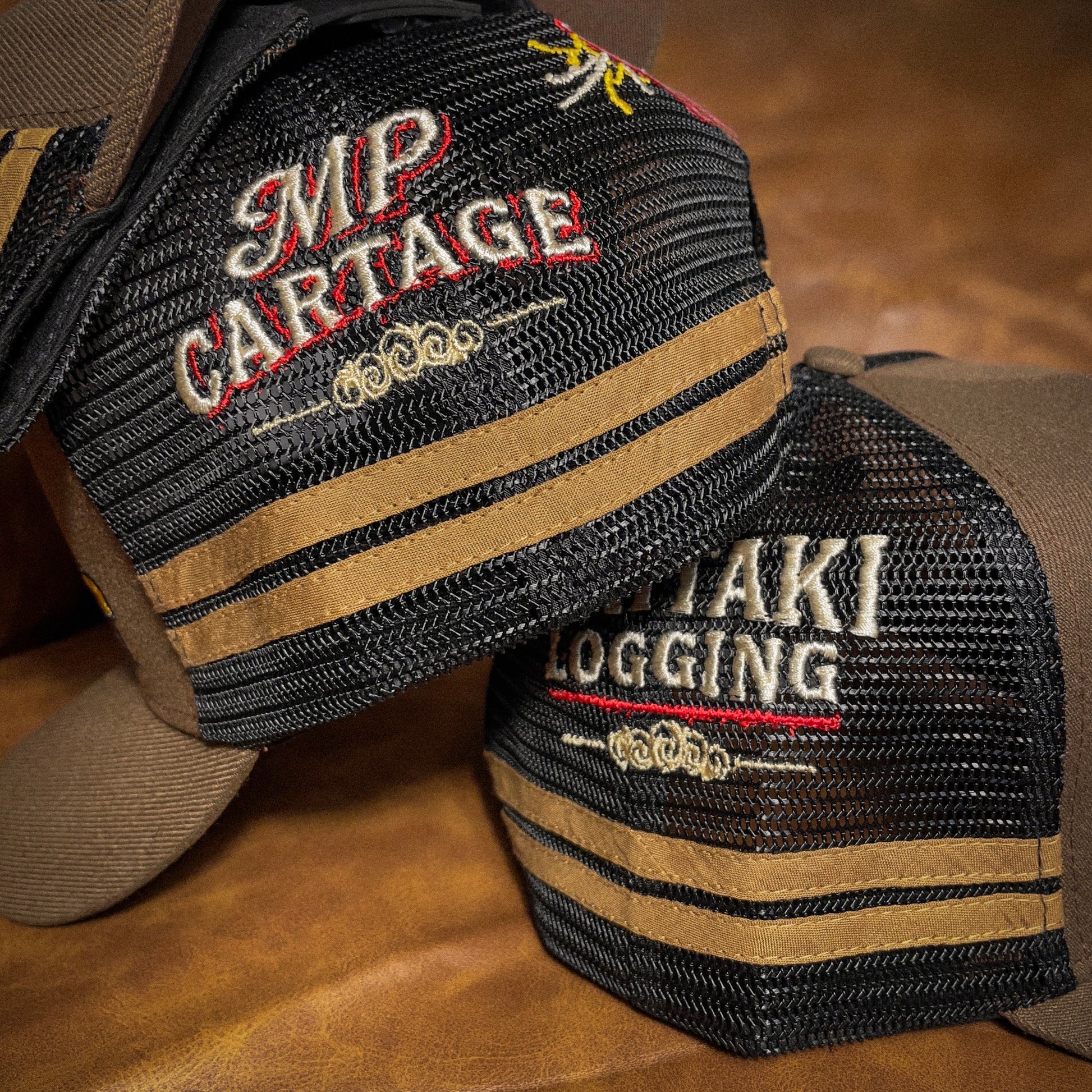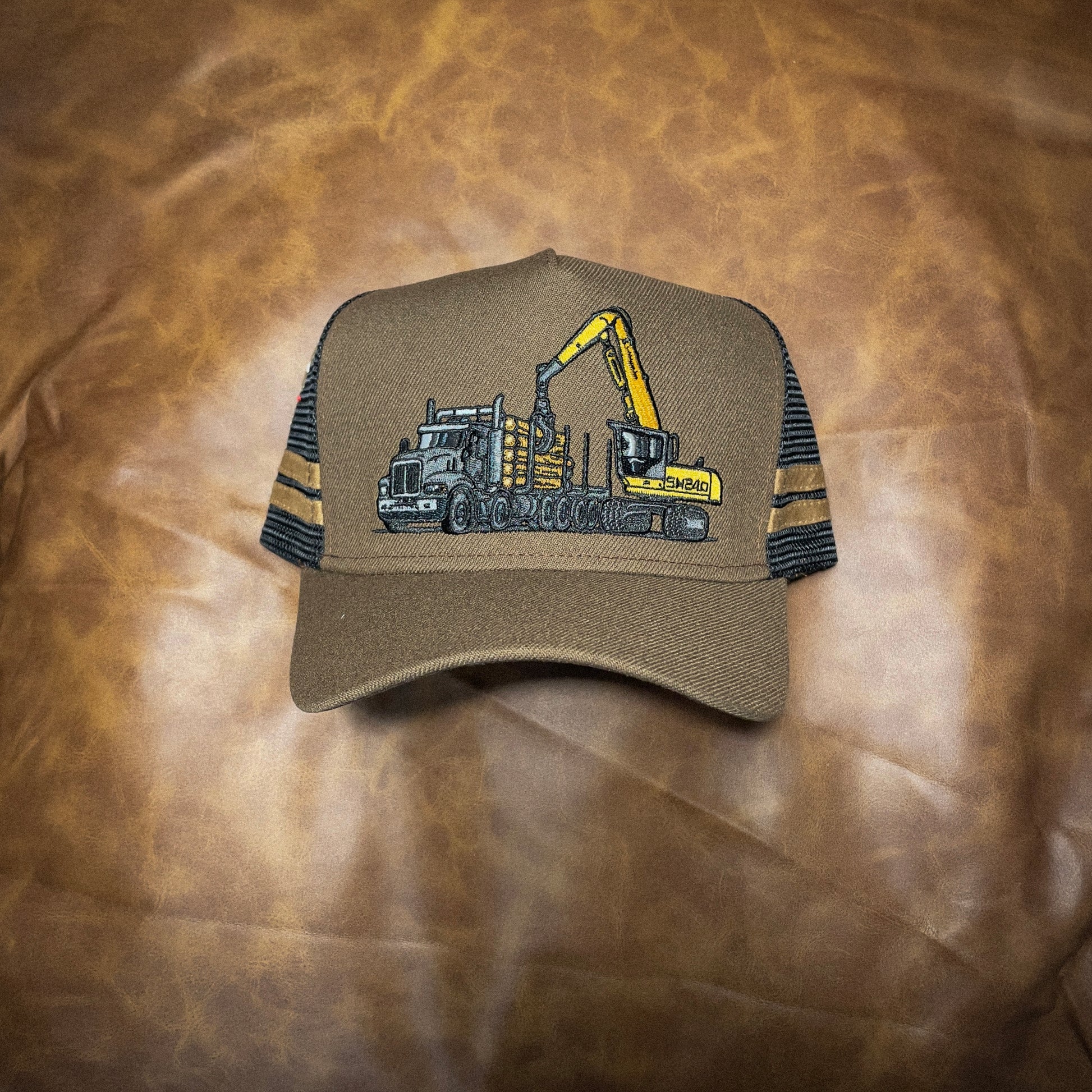 Front and centre sits a detailed embroidery of the log truck and SM240 loader in action, a scene that sums up the grind, grit, and pride of NZ’s forestry crews. The black mesh panels are finished with vintage inspired tan striping and custom side embroidery for both companies, giving this cap a premium fleet look that stands out from every angle.